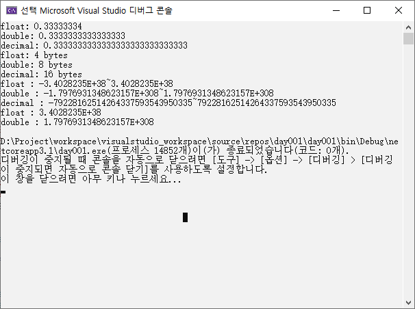 각각 float, double, decimal 의 바이트 크기도 sizeof() 메소드를 이용하여 출력해보았다.