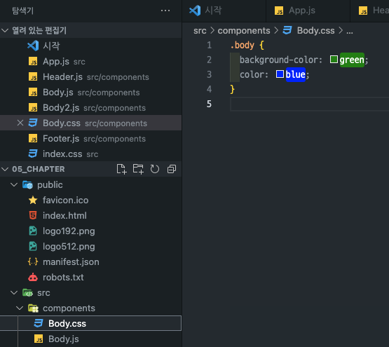 다음은 Body 컴포넌트 함수에 css를 적용하는 예시이다.
