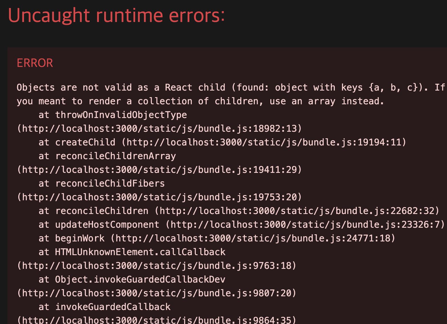 콘솔에 찍힌 에러를 살펴보면 Object are not valid as a React Child" 메세지 나오는데,