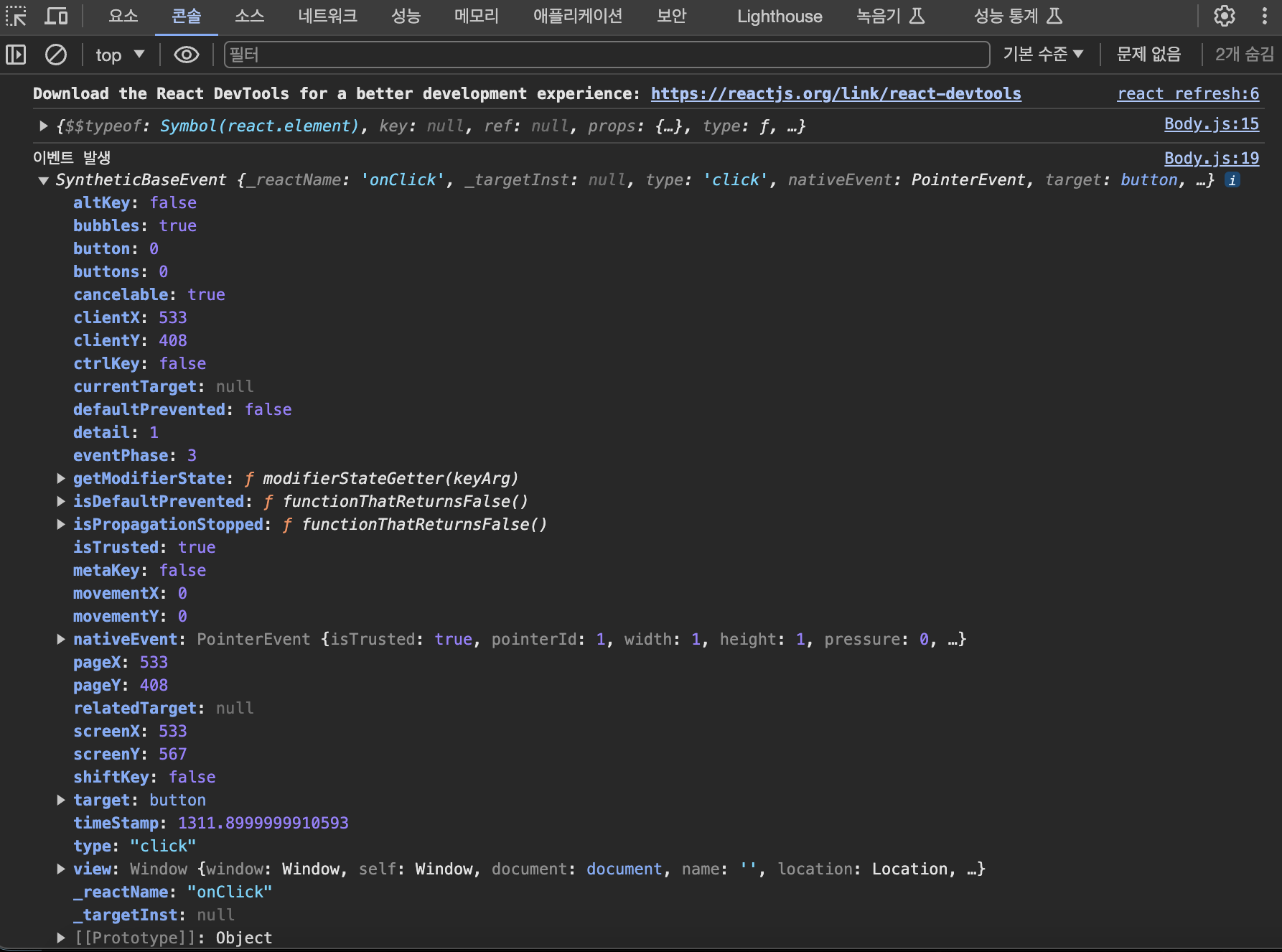 페이지에서 버튼을 클릭하면 이벤트가 호출이되고 이벤트가 가지고있는 여러 이벤트 객체 프로퍼티들이 내장되어있는 것을 확인 할 수 있다.