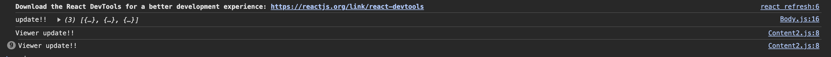 첫 번째 뜬 Viewer update!! console은 페이지가 처음 렌더링 할 때 출력된 부분이고